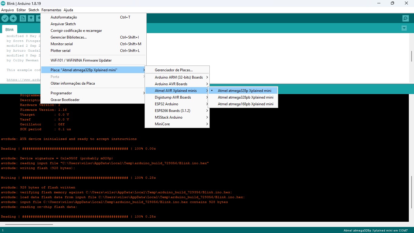 Obs: No software Arduino esta placa vai aparecer como "Atmel atmega328p Xplained mini"